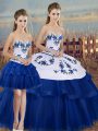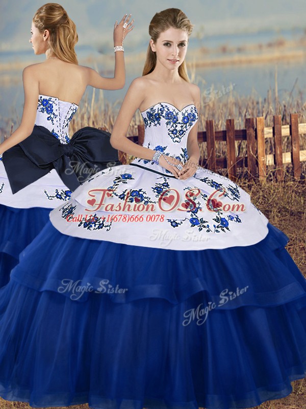 Tulle Sweetheart Sleeveless Lace Up Embroidery and Bowknot Quince Ball Gowns in Royal Blue