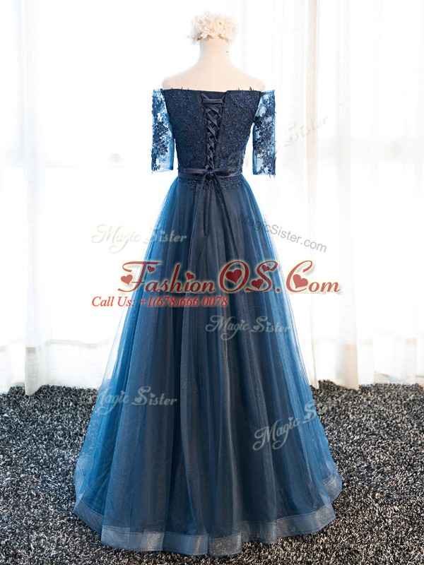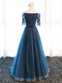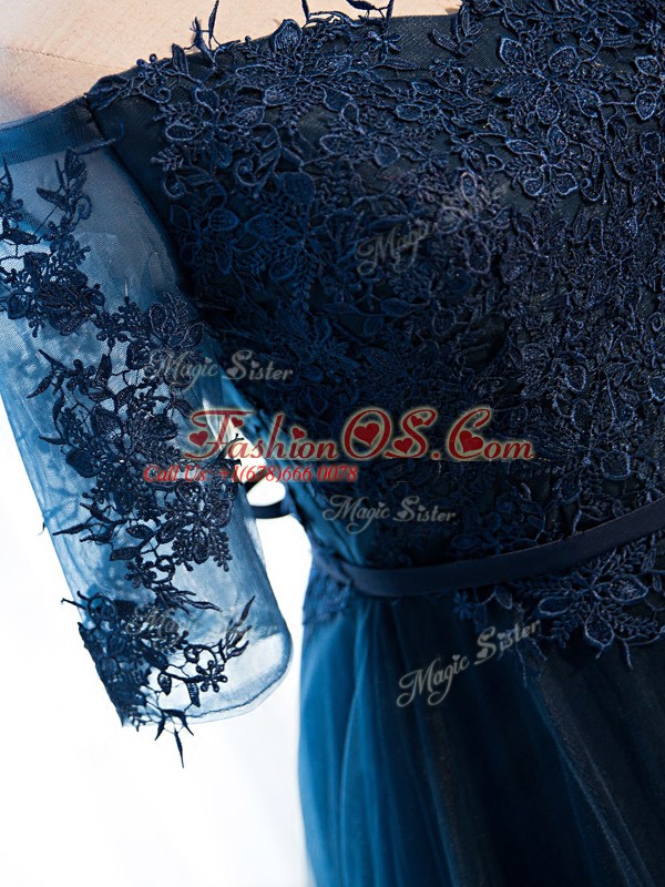 Tulle V-neck Half Sleeves Lace Up Beading and Lace and Appliques Mother Of The Bride Dress in Navy Blue