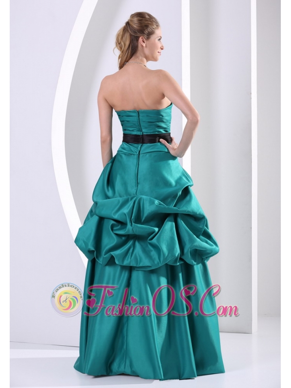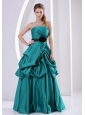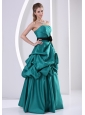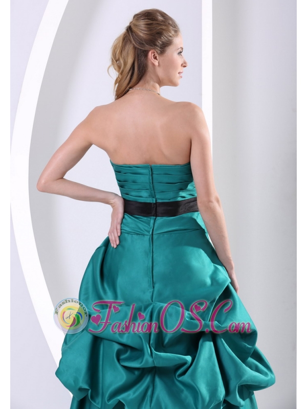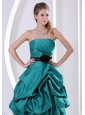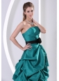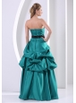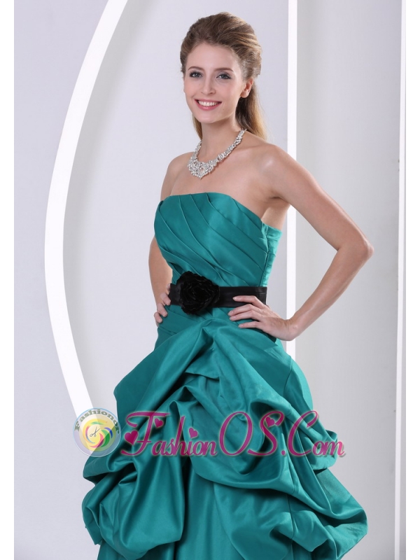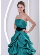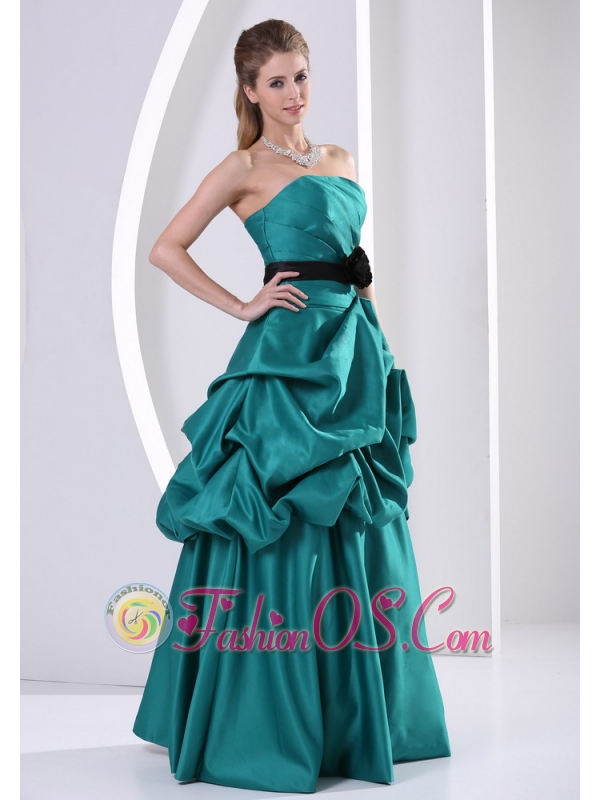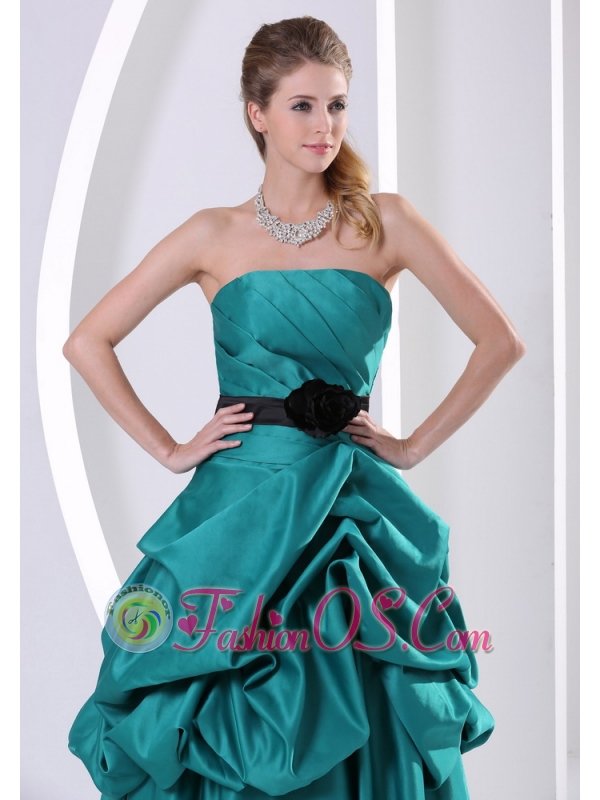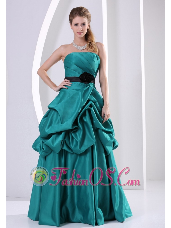 If you wear this unique dress, you will be the queen in the dance floor! This elegant dress features a strapless pleated bodice, the waist is decorated by a broad waistband and the handed flower on the band that adds the stunning look. The slightly puffy skirt is accented with pick-ups which adds to its overall fullness! A zipper up back finishes the look. Throughout turquoise colored dress, the elegant and poised temperature is displayed entirely.