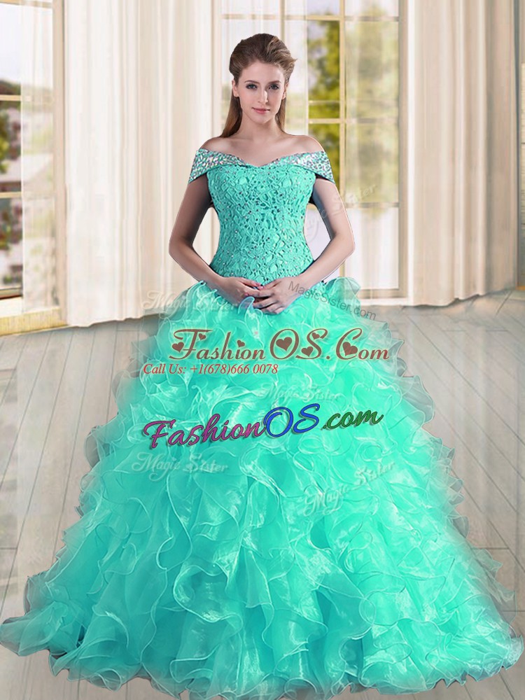 Turquoise A-line Off The Shoulder Sleeveless Organza Sweep Train Lace Up Beading and Lace and Ruffles 15th Birthday Dress
