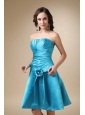 Turquoise A-line Strapless Knee-length Satin Hand Made Flower Prom / Homecoming Dress
