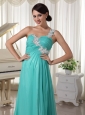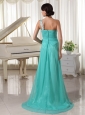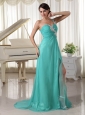 Home >  Prom Dresses >  Modest Prom Dresses > Turquoise Appliques Decorate One Shoulder and Bust Sexy Prom Dress With High Slit Chiffon and Elastic Woven Satin Brush Train