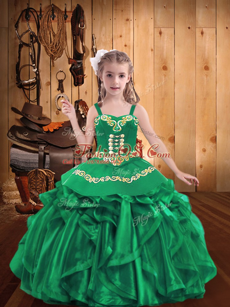 Turquoise Ball Gowns Organza Straps Sleeveless Embroidery and Ruffles Floor Length Lace Up Pageant Dress Toddler