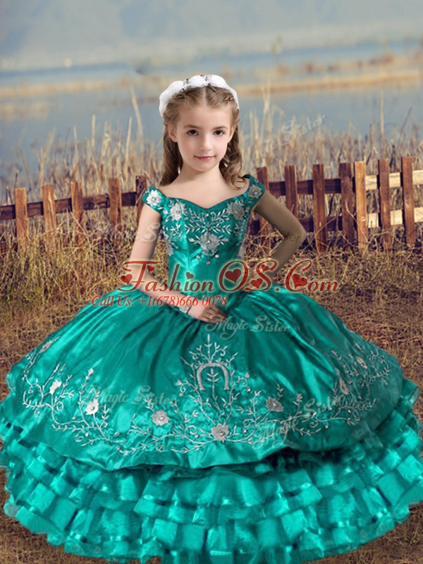 Turquoise Ball Gowns Satin and Organza Off The Shoulder Sleeveless Embroidery and Ruffled Layers Floor Length Lace Up Pageant Gowns For Girls