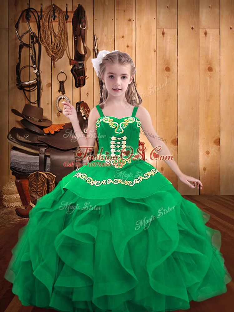 Home >  Special Occasion Dresses >  Lovely Little Girl Pageant Dresses > Turquoise Ball Gowns Straps Sleeveless Organza Floor Length Lace Up Embroidery and Ruffles Pageant Gowns For Girls