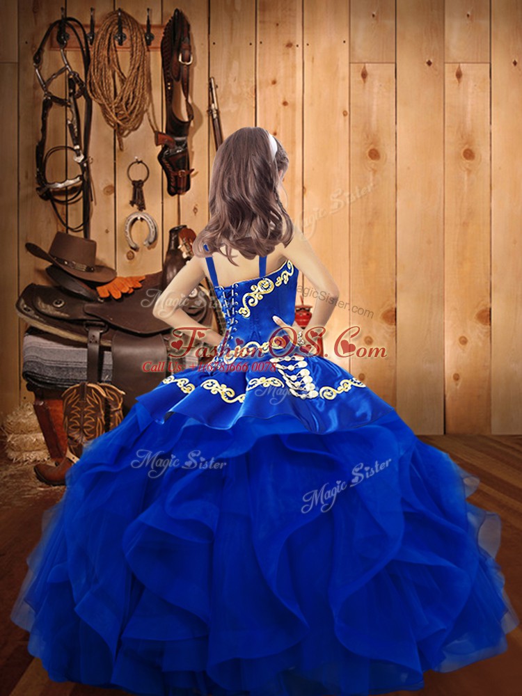 Turquoise Ball Gowns Straps Sleeveless Organza Floor Length Lace Up Embroidery and Ruffles Pageant Gowns For Girls