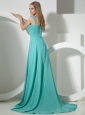 Home >  Evening Dresses > Turquoise Brush Train Gorgeous Evening Dress With Beaded and Ruch Decorate Straps Chiffon