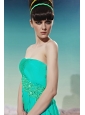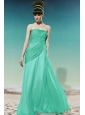 This green prom dress features a strapless bodice with ruchings and beadings which look like flowers. The loose ruchings on the hip part adds beauty and grace to the dress. The flowing skirt is also the good point of this dress. The special prom dress is sure to impress at your prom or special occasion party. It can make you more charming and elegant.