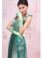 Opulence is the word written all over this dress. It is truly an example of high end couture fashion. It features a gorgeous bodice with unique neckline in lovely ruches and beadworks. The bowknots and beadings decorate the waistline and show your slim figure. Exquisite appliques in the sides add the charm and interest. The floor-length skirt with a sweep train is soft and elegent. Two beautiful fabrics are attached from the waist in the front and flows freely down to cascade to floor, creating a stunning silhouette. There is also a similar dress for you to choose.