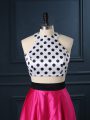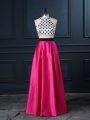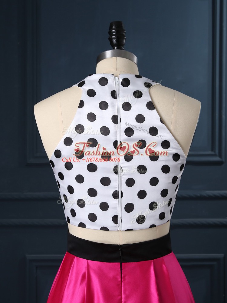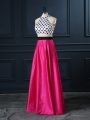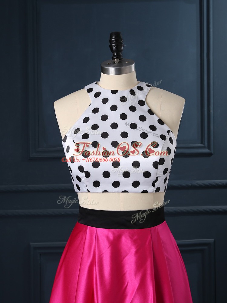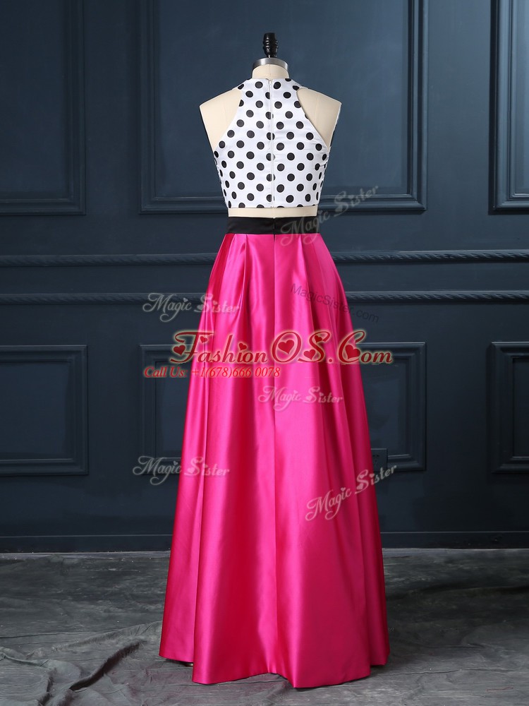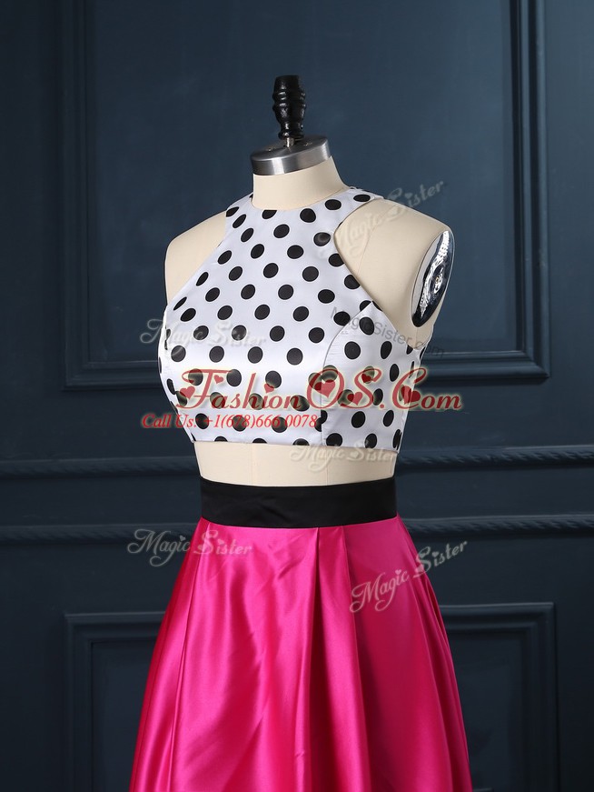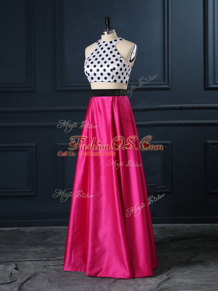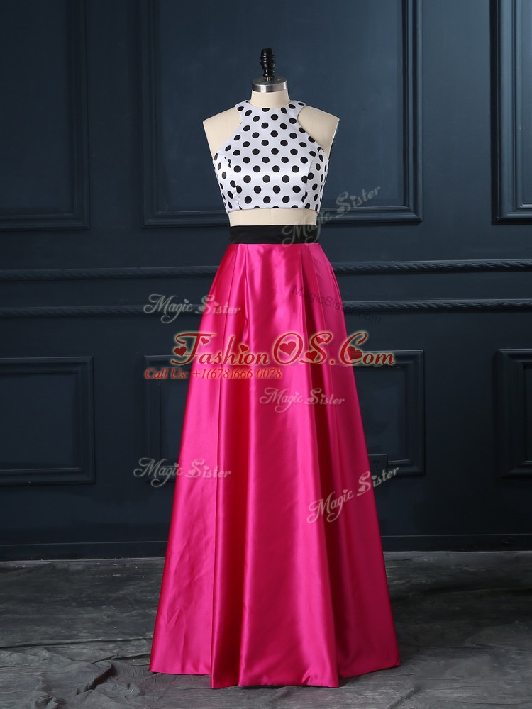 Two Pieces Hoco Dress Hot Pink Scoop Satin Sleeveless Floor Length Lace Up