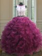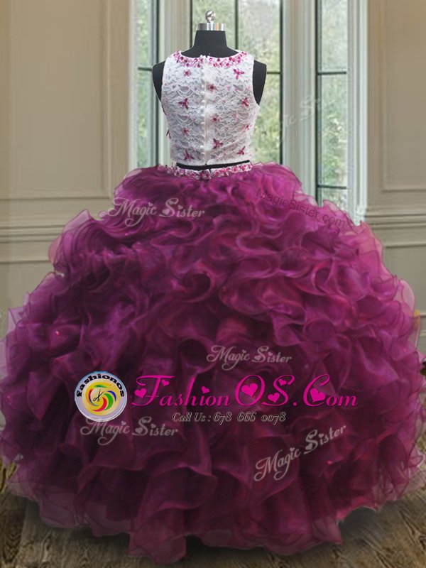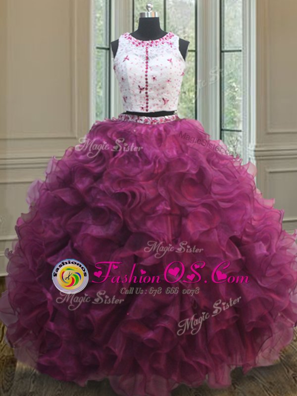Two Pieces Organza Scoop Sleeveless Zipper Beading and Lace and Ruffles Quinceanera Gowns in Burgundy