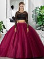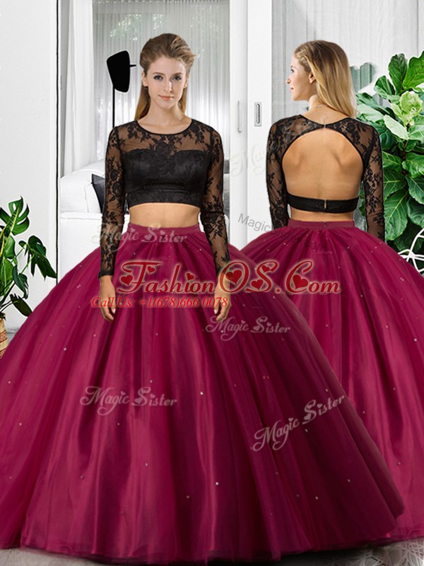 Two Pieces Vestidos de Quinceanera Fuchsia Scoop Tulle Long Sleeves Floor Length Backless