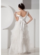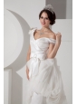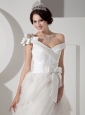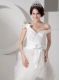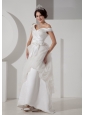 Go for a charming, feminine look on your wedding day in this dress.The cap-sleeve, portrait neckline frames your choice of heirloom jewels, and tone-on-tone, floral appliques blossom at one shoulder. A contrasting band fits closely around the waist and boasts draping sashes. A fabric blossom secures the turned-back over skirt at side front, and loose folds shape a bustle in back.