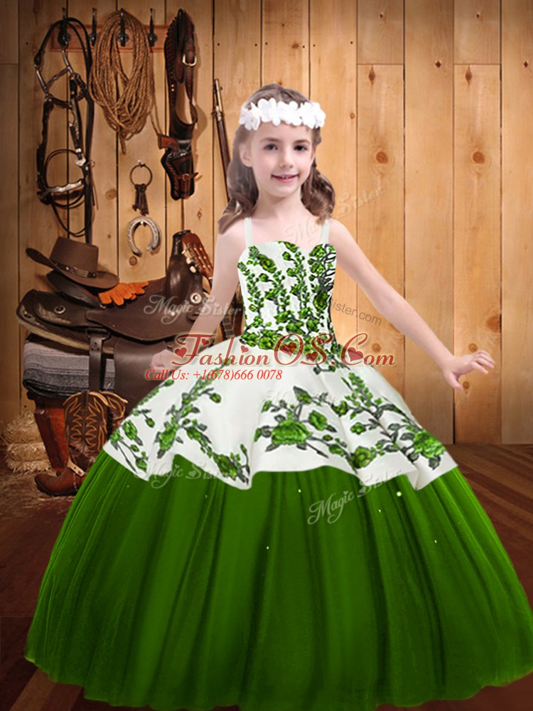 Unique Floor Length Green Kids Pageant Dress Tulle Sleeveless Embroidery