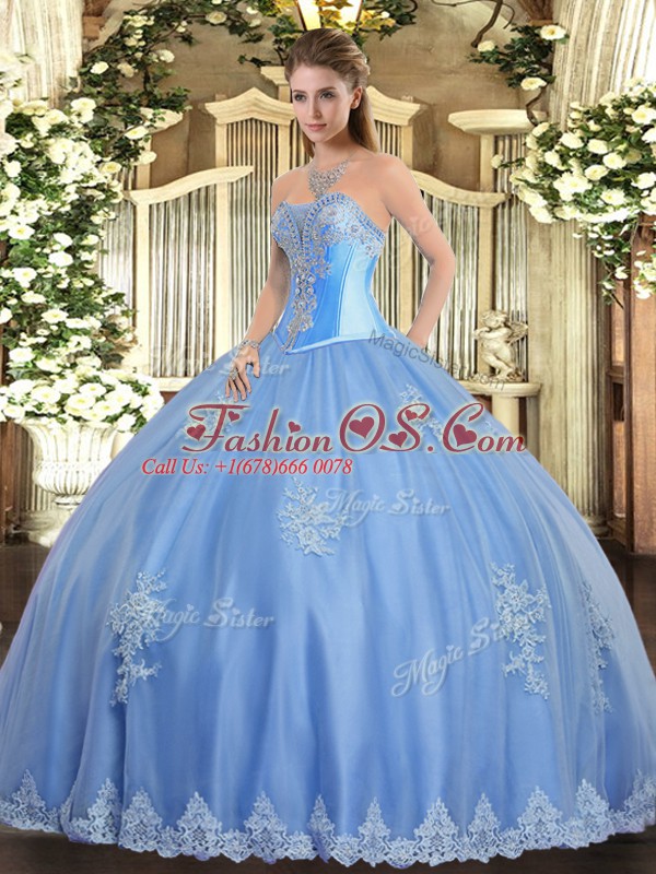 Unique Floor Length Lace Up Sweet 16 Quinceanera Dress Baby Blue for Military Ball and Sweet 16 and Quinceanera with Beading and Appliques