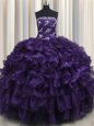Unique Floor Length Purple Quinceanera Dress Organza Sleeveless Appliques and Ruffles and Ruffled Layers