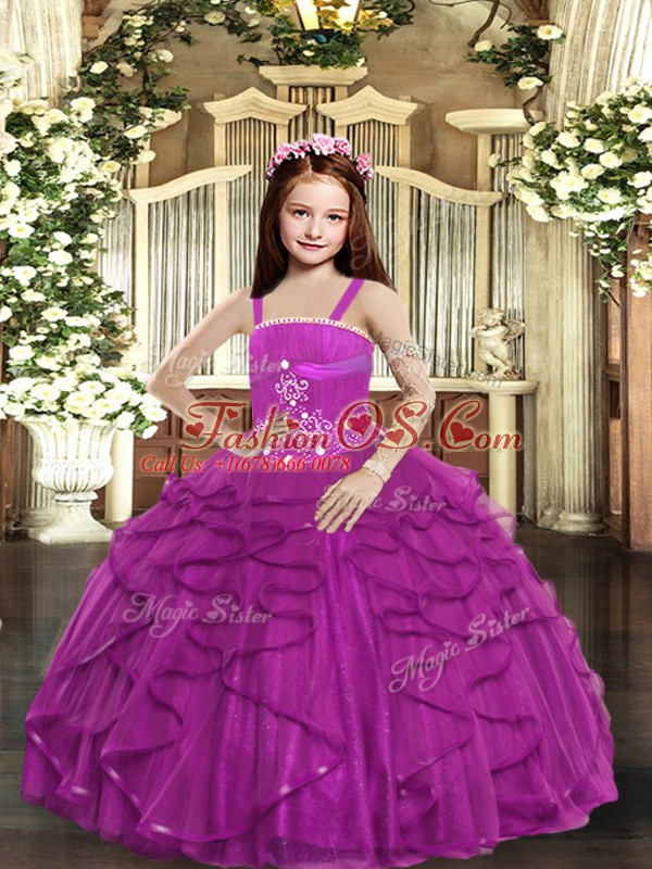 Home >  Special Occasion Dresses >  Beautiful Kids Pageant Dresses > Unique Fuchsia Straps Neckline Beading and Ruffles Pageant Dresses Sleeveless Lace Up
