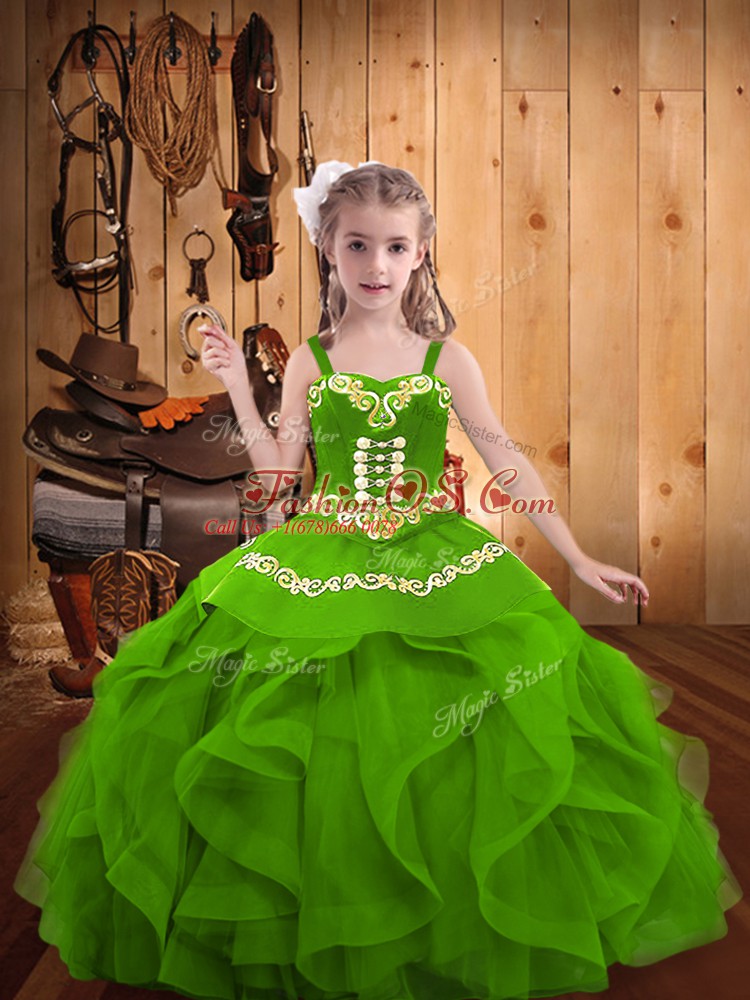 Home >  Special Occasion Dresses >  Lovely Little Girl Pageant Dresses > Unique Green Ball Gowns Straps Sleeveless Organza Floor Length Lace Up Beading and Embroidery and Ruffles Little Girls Pageant Gowns