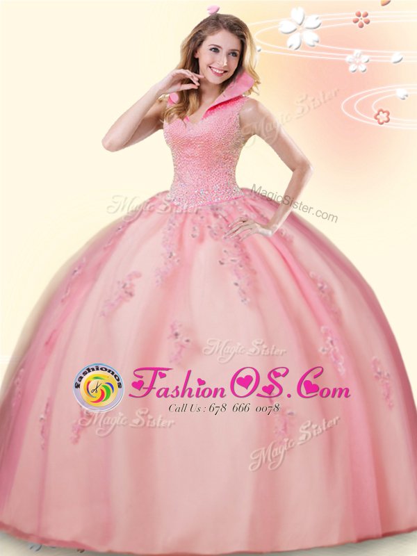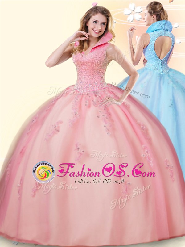 Unique High-neck Sleeveless Backless Quinceanera Dresses Pink Tulle
