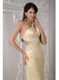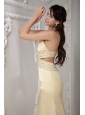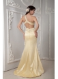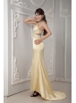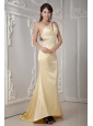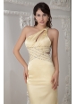 Unique Light Yellow Column Prom Dress One Shoulder Satin Beading Brush Train