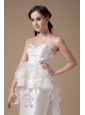 An elegant and romantic wedding gown. It has a lovely strapless bodice with a gathered texture and dreamful skirt. The bodice is made from smooth taffeta which makes the dress more dignity. The midsection of the gown is cinched by gorgeous embroidery that perfectly complements the rhinestones on the bodice. The dainty ruffles and the mermaid style skirt add to the romantic statemant. A lace up closure in the back secures the dress and completes this perfect design.