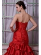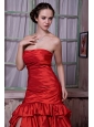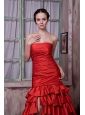 Unique Red A-line Strapless Prom Dress Cathedral Train Taffeta Ruffled Layers