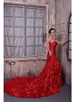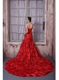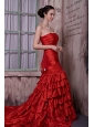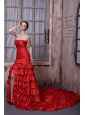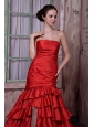 Home >  Prom Dresses >  Unique Prom Dresses > Unique Red A-line Strapless Prom Dress Cathedral Train Taffeta Ruffled Layers
