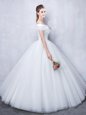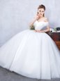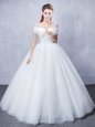 Unique Ruffled Tulle Off The Shoulder Short Sleeves Lace Up Ruching Bridal Gown in White