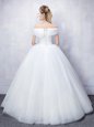Home >  Wedding Dresses >  Low Cost Wedding Dresses > Unique Ruffled Tulle Off The Shoulder Short Sleeves Lace Up Ruching Bridal Gown in White