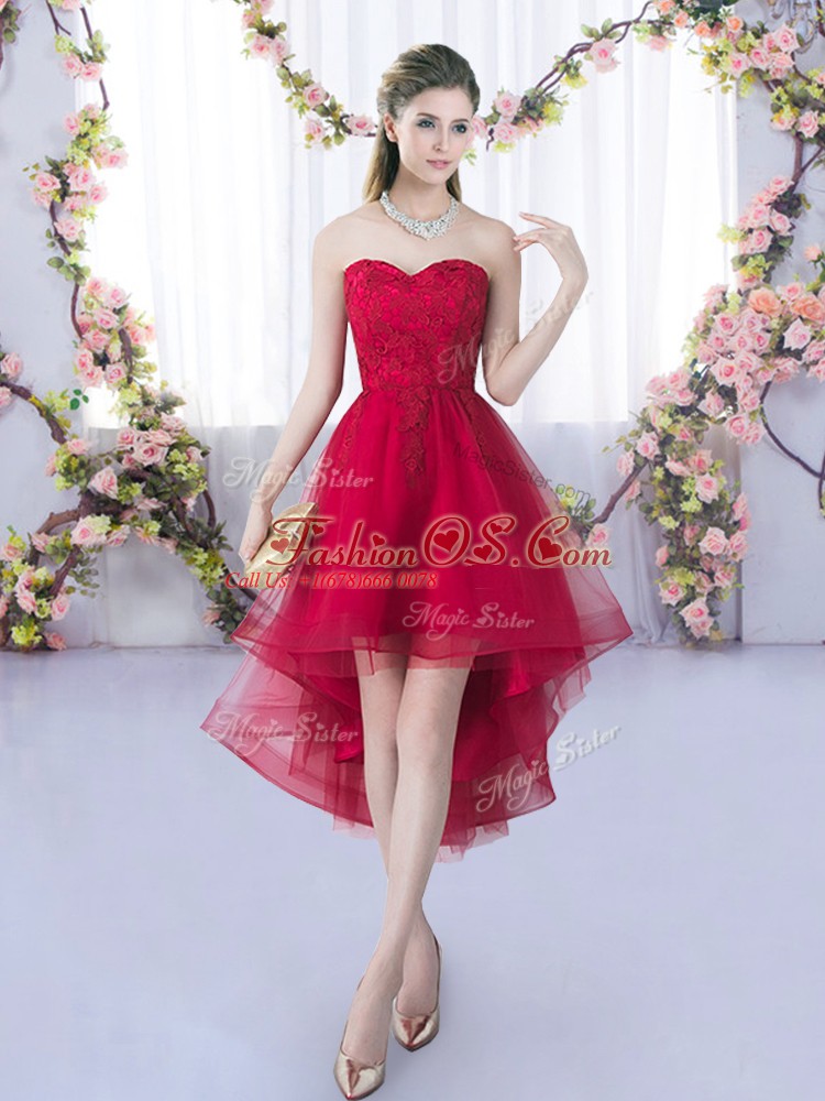 Home >  Bridesmaid Dresses >  Perfect Bridesmaid Dresses > Unique Sweetheart Sleeveless Wedding Party Dress High Low Lace Wine Red Tulle