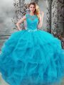 Unique Tulle Scoop Sleeveless Lace Up Beading and Ruffles Vestidos de Quinceanera in Baby Blue
