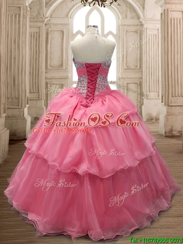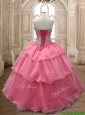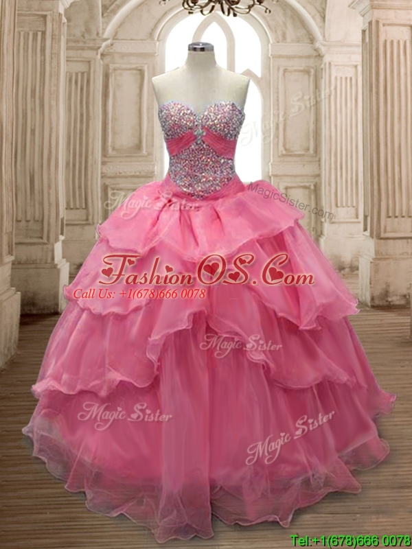 Home >  Quinceanera Dresses >  Fast Delivery Quinceanera Dresses > Unique Watermelon Red Organza Quinceanera Dress with Beading and Ruffled Layers