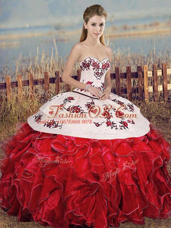 Unique White And Red Sleeveless Embroidery and Ruffles and Bowknot Floor Length Quinceanera Dresses