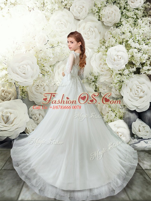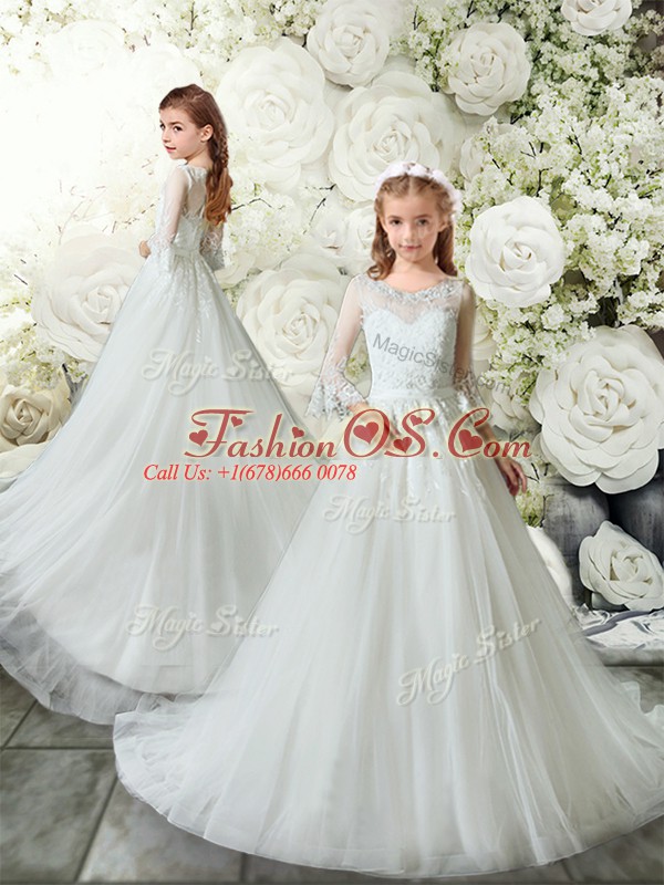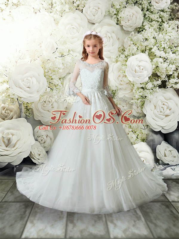 Unique White Toddler Flower Girl Dress Wedding Party with Lace Scoop 3 4 Length Sleeve Brush Train Clasp Handle