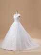 Unique With Train White Wedding Dress Tulle Brush Train Short Sleeves Beading and Appliques