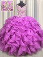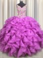 V Neck Fuchsia Lace Up Sweet 16 Quinceanera Dress Beading and Ruffles Sleeveless Floor Length