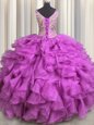 Home >  Quinceanera Dresses >  Fashionable Quinceanera Dresses > V Neck Fuchsia Lace Up Sweet 16 Quinceanera Dress Beading and Ruffles Sleeveless Floor Length