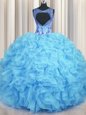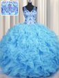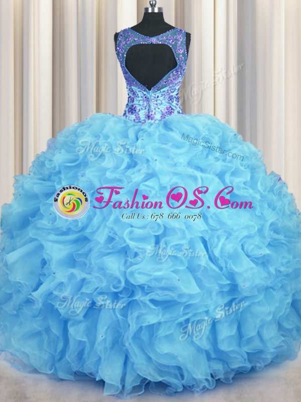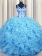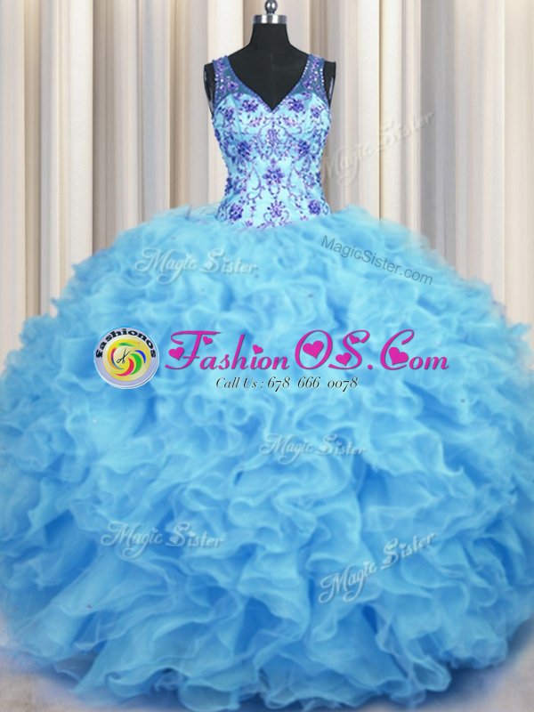 Home >  Quinceanera Dresses >  Fast Delivery Quinceanera Dresses > V Neck Organza Sleeveless Floor Length Ball Gown Prom Dress and Beading and Appliques and Ruffles