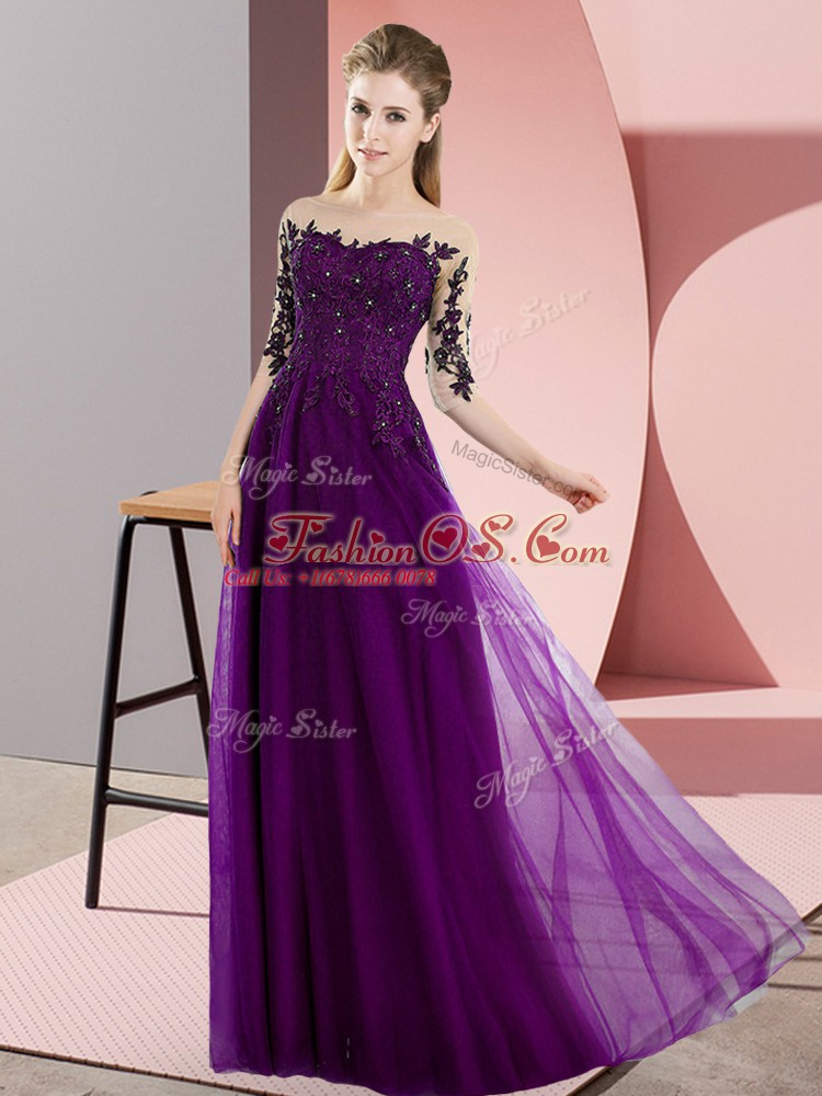 Vintage Dark Purple Empire Beading and Lace Dama Dress Lace Up Chiffon Half Sleeves Floor Length