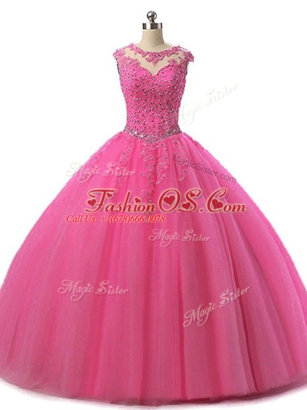 Vintage Hot Pink Lace Up Scoop Beading and Lace Quinceanera Gown Tulle Sleeveless