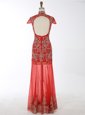 Vintage Mermaid Cap Sleeves Chiffon Floor Length Backless Dress for Prom in Red for with Beading and Appliques