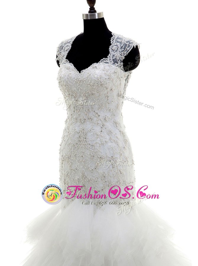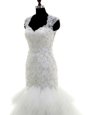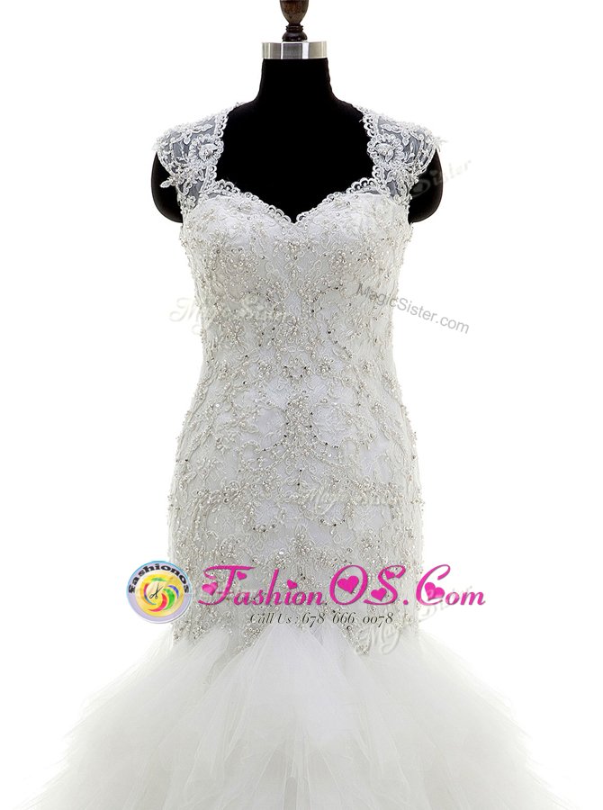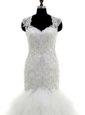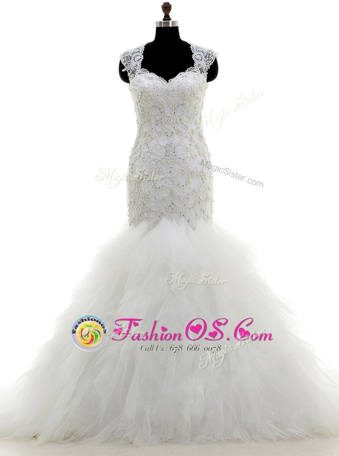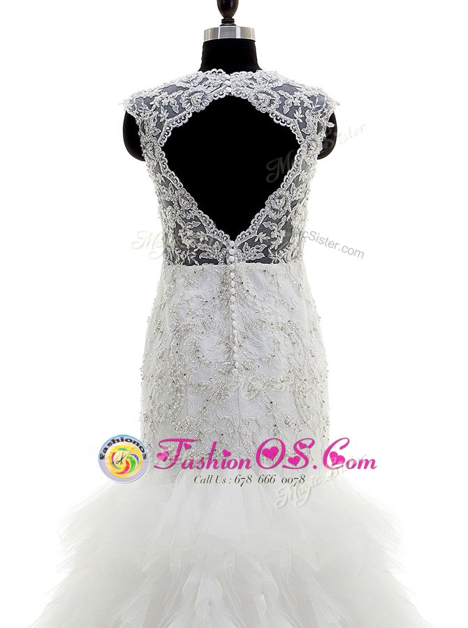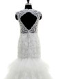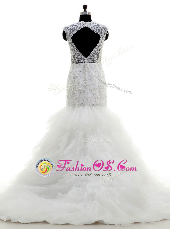 Vintage Mermaid Cap Sleeves With Train Beading and Lace and Ruffles Clasp Handle Wedding Dress with White Brush Train
