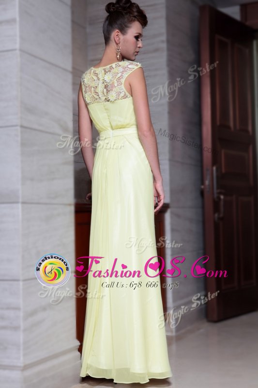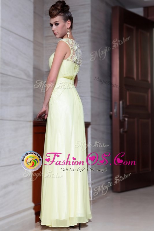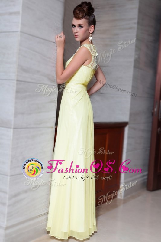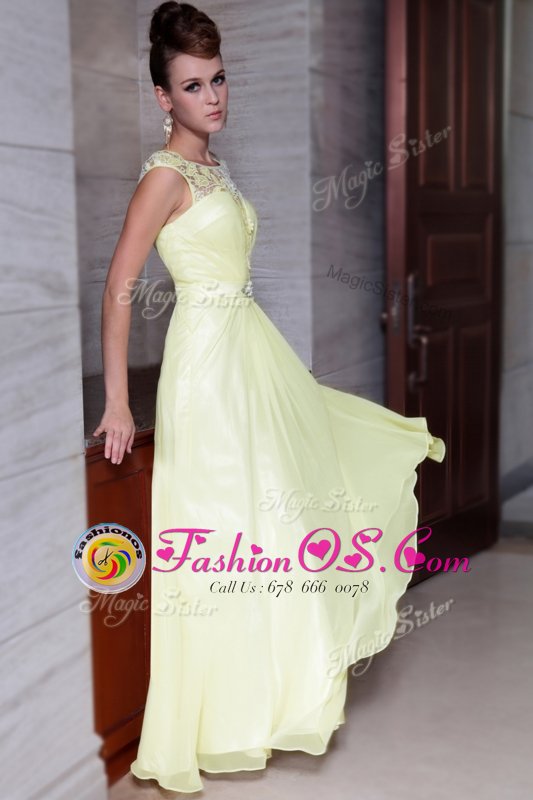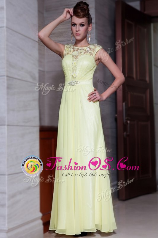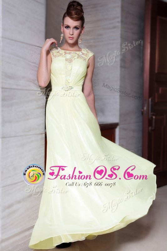 Vintage Scoop Light Yellow Cap Sleeves Beading and Hand Made Flower Floor Length Prom Dresses
