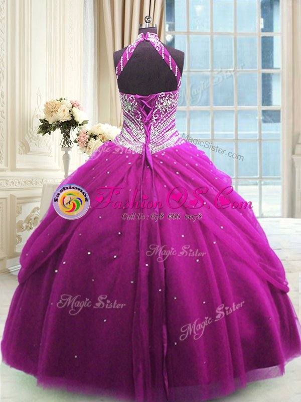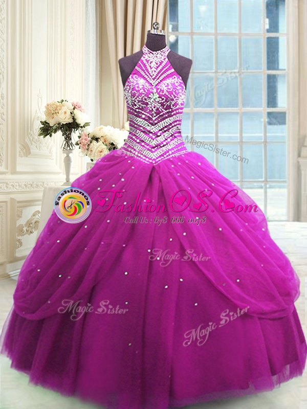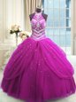 Vintage Sleeveless Floor Length Beading Lace Up Quinceanera Gowns with Fuchsia