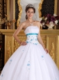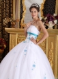When white meets blue, illusion emerges. This elegant straight neckline white tulle quinceabera dress is accented with equisite white appliques decorated with clear blue stones and paillettes on the bodice and the bottom of the dress. With the beaded neckline and the blue wide strp at the waistline, you will find yourself in a wonderland in this elegant dress!