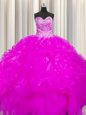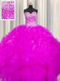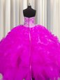 Home >  Quinceanera Dresses >  Pretty Quinceanera Dresses > Visible Boning Beaded Bodice Sleeveless Floor Length Beading and Ruffles Lace Up 15th Birthday Dress with Fuchsia