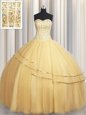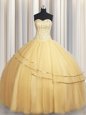 Visible Boning Big Puffy Champagne Ball Gowns Beading and Ruching Quinceanera Gown Lace Up Organza Sleeveless Floor Length