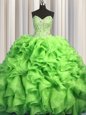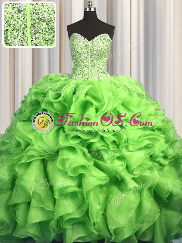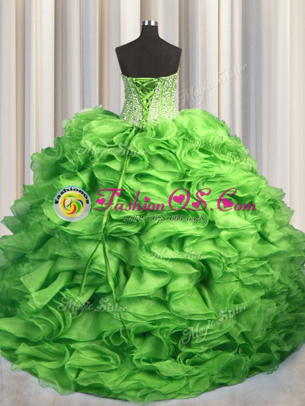 Home >  Quinceanera Dresses >  Fast Delivery Quinceanera Dresses > Visible Boning Brush Train Green Ball Gowns Beading and Ruffles Quince Ball Gowns Lace Up Organza Sleeveless With Train