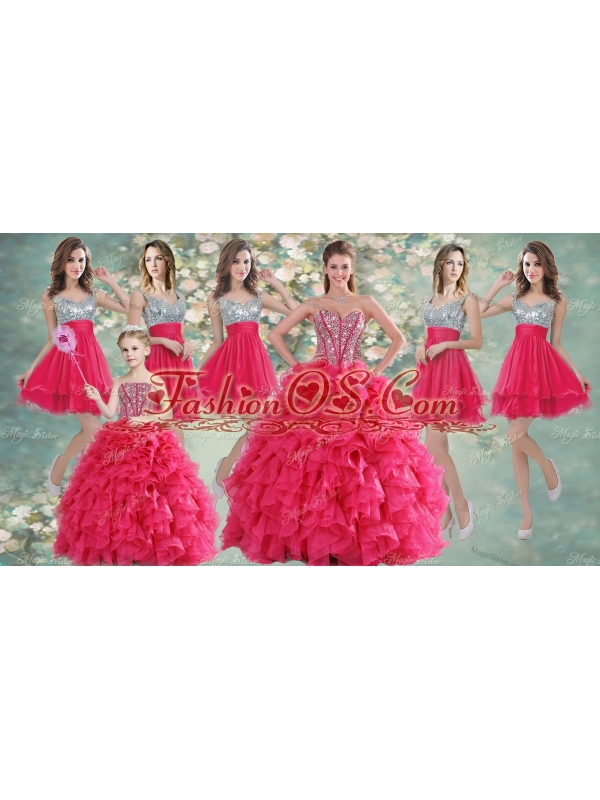 Home >  Quinceanera Dresses >  Quinceaneara Package > Visible Boning Coral Red Quinceanera Dress and Short Sequined Dama Dresses and Beaded and Ruffled Mini Quinceanera Dress