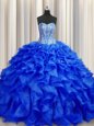 Visible Boning Royal Blue Sleeveless Beading and Ruffles Lace Up Quince Ball Gowns